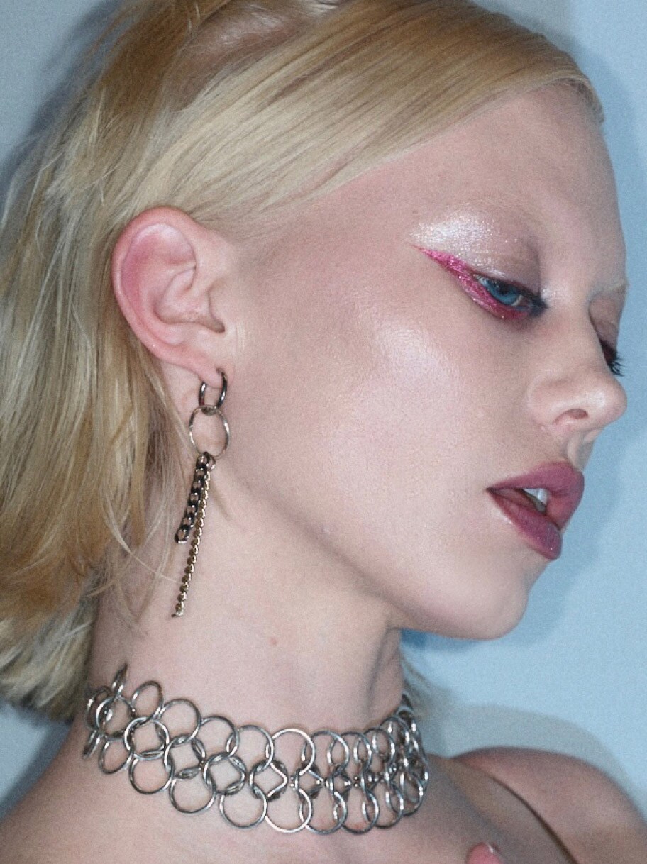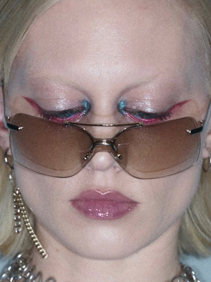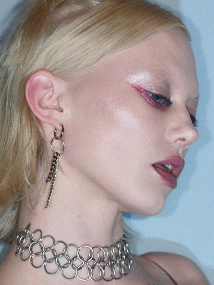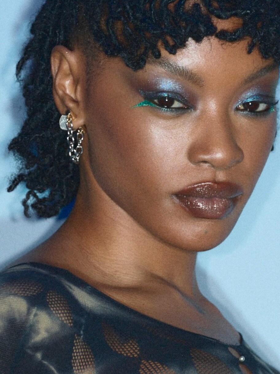 Shadeshift Chrome Eye Shadow und Dazzleshadow Liquid werden gezielt am unteren Wimpernkranz aufgetragen. „Es war ein Spiel mit dem traditionellen Eyeliner. Aber statt oben, tragen wir ihn unten auf, sehr futuristisch, sehr gewagt.“ Das Zusammenspiel dieser glänzenden, fast spiegelnden Metallics ist pure Y3K-Ästhetik.