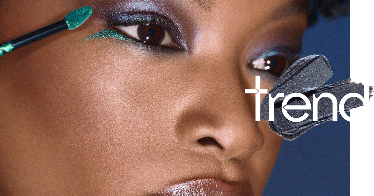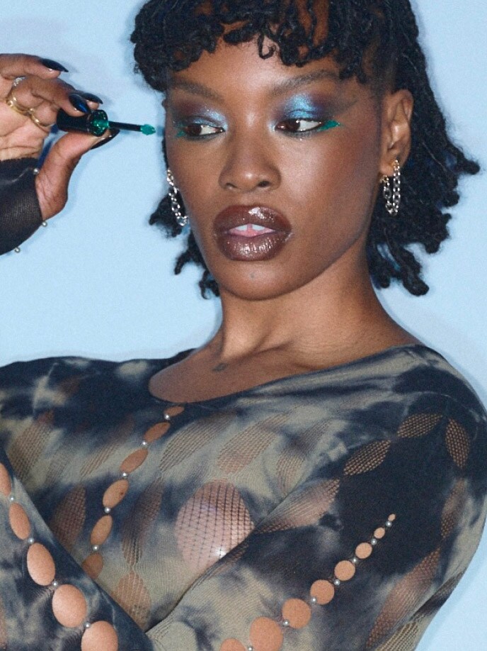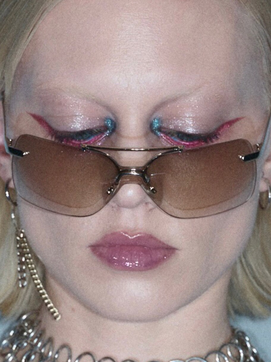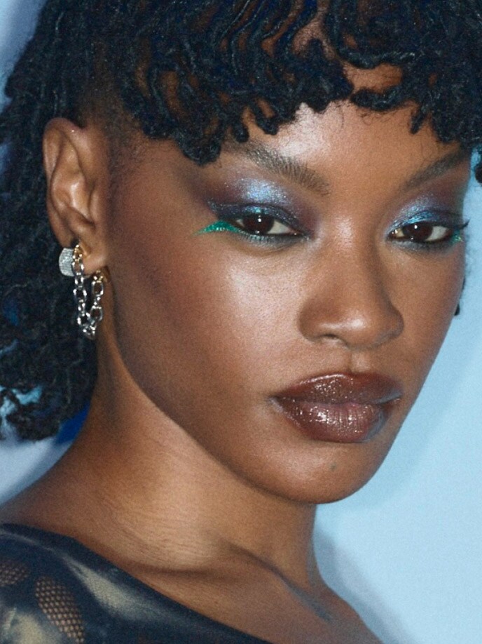 Shadeshift Chrome Eye Shadow und Dazzleshadow Liquid werden gezielt am unteren Wimpernkranz aufgetragen. „Es war ein Spiel mit dem traditionellen Eyeliner. Aber statt oben, tragen wir ihn unten auf, sehr futuristisch, sehr gewagt.“ Das Zusammenspiel dieser glänzenden, fast spiegelnden Metallics ist pure Y3K-Ästhetik.